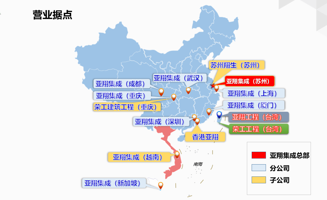 1978年母公司亞翔工程成立,由基礎(chǔ)循序漸進(jìn)的成長(zhǎng),跟隨臺(tái)灣地區(qū)工業(yè)的脈動(dòng),順應(yīng)時(shí)空背景的轉(zhuǎn)變,調(diào)整經(jīng)營(yíng)觀(guān)念、開(kāi)發(fā)新技術(shù),在傳統(tǒng)的機(jī)電工程業(yè)中脫穎而出。2002年亞翔集成在蘇州成立,憑借領(lǐng)先的技術(shù)與現(xiàn)代化的管理,陸續(xù)在國(guó)內(nèi)各地設(shè)立了分子公司。目前亞翔集成已成為一個(gè)起源于臺(tái)灣地區(qū),扎根中國(guó)大陸,觸角延伸至新加坡、東南亞與中國(guó)大陸各地的跨國(guó)公司。未來(lái)力爭(zhēng)服務(wù)整個(gè)亞洲,乃至全球。