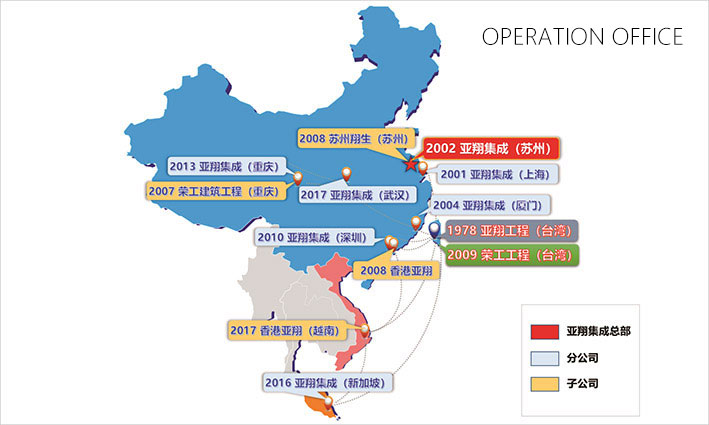The parent company, L&K Engineering Co. Ltd. was founded in 1978, grew and accompanied with the pace of Taiwan district’s industrial development to adjust management concept, develop new techniques, and emerged from traditional electric/mechanical engineering field. In 2002, L&K Engineering was set up in Suzhou, and then established branch companies in many other cities in China one after another via advanced technology and modern management system. Now, L&K Engineering already becomes a multinational corporation which stems from Taiwan district, taking root in mainland China, and extends his business coverage to Singapore, Southeast Asia. L&K Engineering strives for providing service to the whole Asia and even the world.