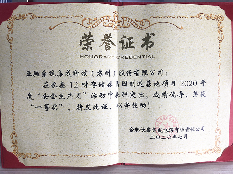 亞翔集成喜獲長(cháng)鑫集成2020年度安全生產(chǎn)月評比一等獎