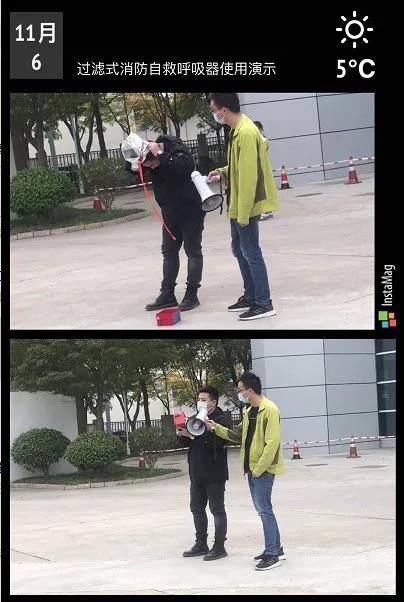 針對火場(chǎng)逃生自救裝置,現場(chǎng)指揮現場(chǎng)講解過(guò)濾式自救呼吸器使用方法及注意事項,并進(jìn)行演示佩戴。