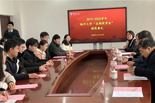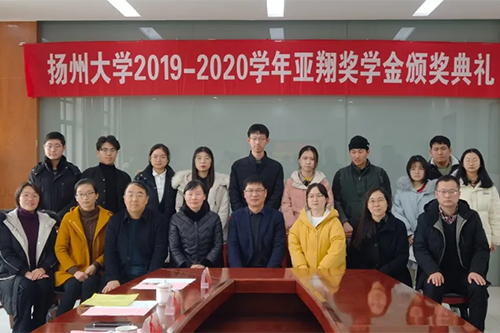 2020年12月18日上午,亞翔獎學(xué)金頒獎典禮在揚州大學(xué)揚子津校區知行樓舉行。公司資深經(jīng)理吳小風(fēng)、揚州大學(xué)學(xué)生工作部副部長(cháng)、資助中心主任王華、機械工程學(xué)院黨委副書(shū)記張平、電氣與能源動(dòng)力工程學(xué)院黨委副書(shū)記陳春霞、環(huán)境科學(xué)與工程學(xué)院黨委副書(shū)記張鋒等人出席了本次頒獎典禮。