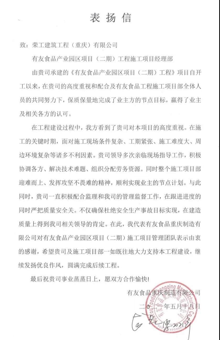 重慶有友項目獲業(yè)主?頒發(fā)的優(yōu)秀項目管理團隊獎杯及表?yè)P信
