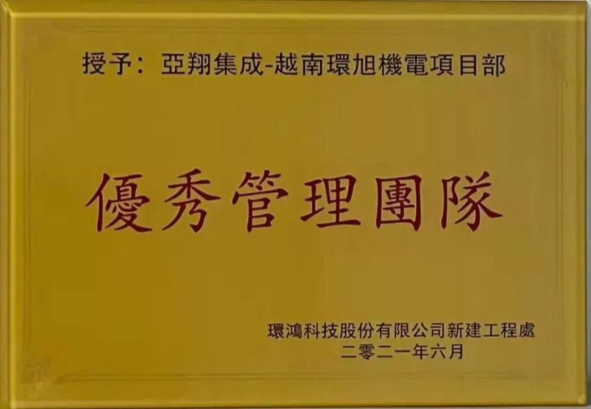 公司榮獲越南環(huán)旭頒發(fā)的“優(yōu)秀管理團隊獎”