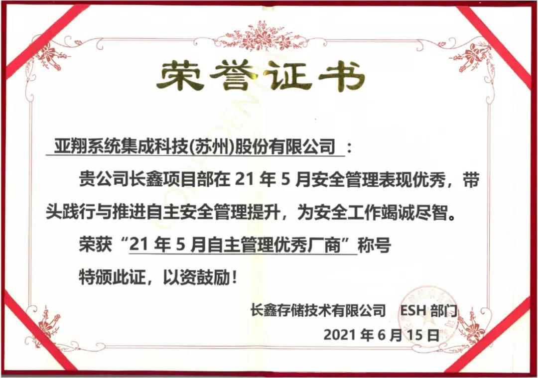 公司榮獲合肥長(cháng)鑫“21年5月自主管理優(yōu)秀廠(chǎng)商”稱(chēng)號