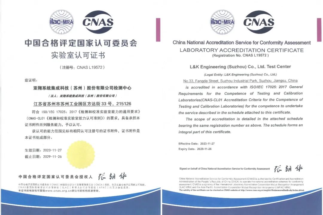 近日,亞翔系統集成科技(蘇州)股份有限公司檢測中心,順利通過(guò)CNAS的評審,并獲得CNAS實(shí)驗室認可證書(shū)(注冊號:CNAS L19572)。